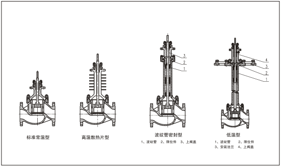 | 系列類型 | 常溫型、中溫型、低溫型。波紋管密封型、夾套保溫型、調(diào)節(jié)切斷型 | |||||||||||||||||||||||||||||||